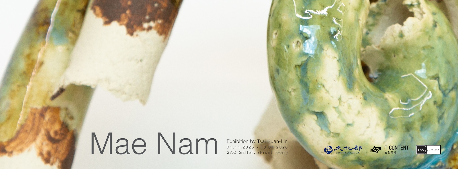 在 SAC Gallery 的 Front Room 空間中,蔡坤霖延續其自 2023 年開始的系列作品《聲譜系列(Resonance Relics)》,並加入在泰國研究期間所得的層次與內容,將聲音探索與田野經驗進行交織。不同於過往在戶外(如台北天母運動公園,2011;美國克里夫蘭 Waterloo Arts,2015;東京六本木之丘,2016)與室內(新竹水道博物館,2018;高雄兒童美術館,2019)所使用的工業管材,蔡坤霖此次轉向更具「有機性」的創作方法,使用陶瓷塑造出帶有生命力與自身生態感的「生物宇宙形態(biocosmic forms)」。這些陶瓷作品全數於清邁製作,並搭配藝術家於駐村期間所錄製的在地環境聲。換言之,這些雕塑所呈現的,是風、土、火、水在地性片段的記憶與殘影,並透過藝術家的視覺實踐被凝固與顯現。